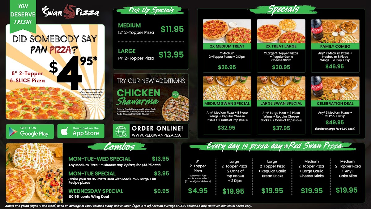 As you step inside Red Swan Pizza, the inviting aroma of freshly baked dough fills the air, making it nearly impossible to resist. The ambiance is cozy and welcoming, perfect for a relaxed family night out or a casual catch-up with friends. Take a seat, and prepare for an experience that feels more like home than a typical restaurant. Customers rave about the quality of the food and the generous portions—enough to satiate every appetite. For those with a sweet tooth, don't miss out on their desserts like the decadent So Good Chocolate Cake or the delightful Tiramisu Cheesecake, both priced at CA$6.95—the perfect finish to your meal!